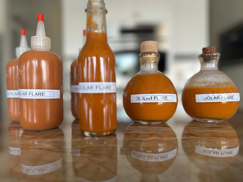 This liquid will thicken up after it sets and cools down, so go light on the thickening agents or pouring from a bottle will be like Ketchup. The blend should seem a little thin when complete and you are ready to transfer into Hot Sauce bottles, using a funnel. It is a good idea to sterilize the bottles in a large pot of water, adding salt for buoyancy. Only flash sterilize the caps or they will warp. Use a hair dryer for the shrink wrap and add labels of you creation. Refrigerate when done.
